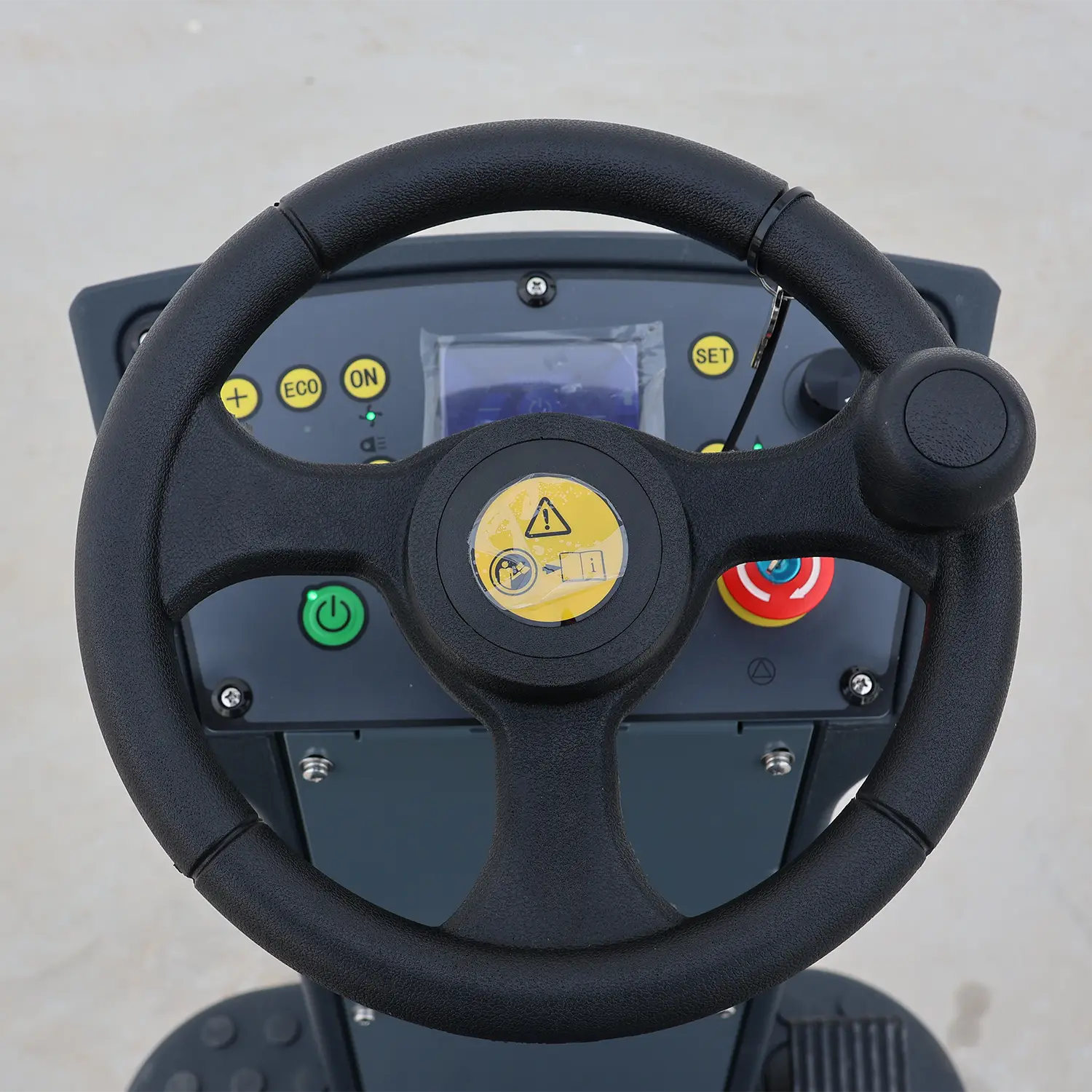 El botón de inicio activa los sistemas de fregado con la última configuración utilizada, simplificando la formación del operario. Desde el panel se gestiona el modo ECO, que permite optimizar el consumo energético, así como los tres niveles de salida de agua, el regulador de velocidad y los avisos de estado (depósitos, nivel de batería, horas de trabajo y códigos de error).