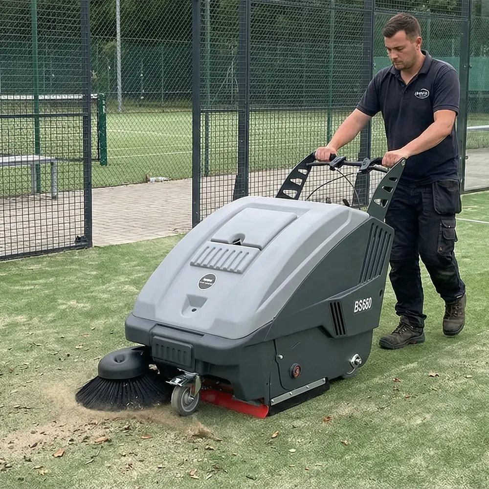 La versión BS680P incorpora un depósito especial con orificios que permite dejar salir la arena mientras recoge residuos, una configuración pensada específicamente para el mantenimiento de superficies deportivas con arena.